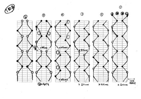 僕は、どうもこういう譜面だと頭がこんがらがってしまって、リズムがわけわかんなくなっちゃうんですが、ちょっと説明すると、「小」は小指側、「親」は親指側で、黒丸はクリック、白丸はハング(つかむやつ)を表しています。